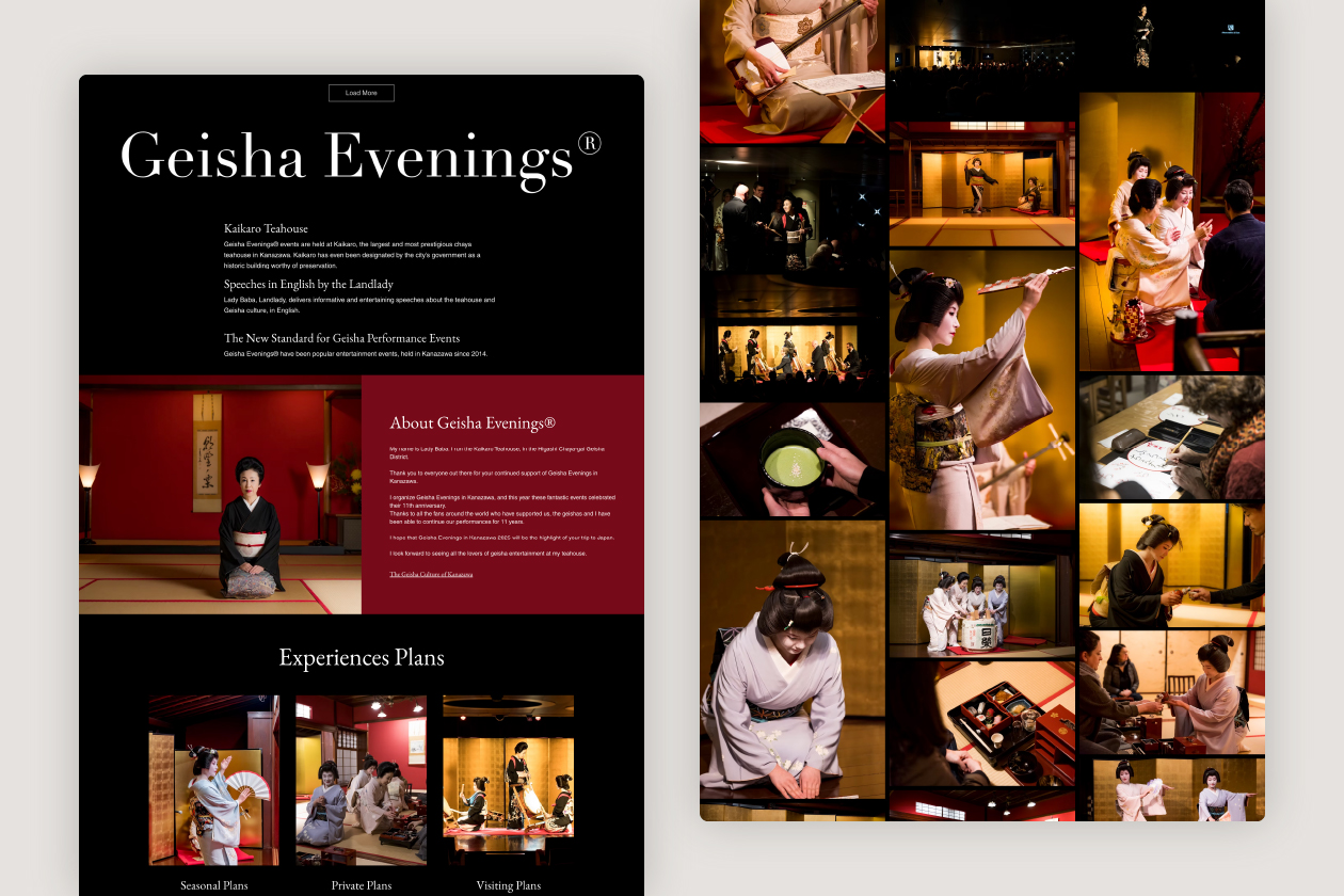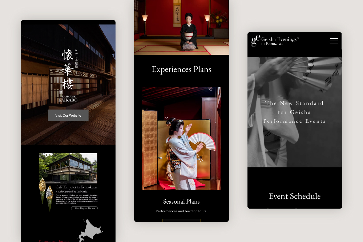 海外向けの芸妓ブランドサイト。高級感あるデザインと英語での情報発信により、訪日客が安心して予約できる構成としました。